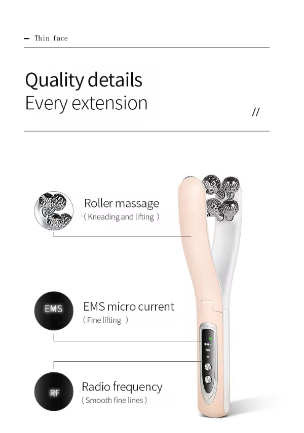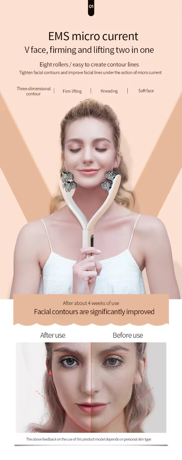 3、V symmetrical lifting, face-fit roller design, slowly lift and “roll” your face V shape
