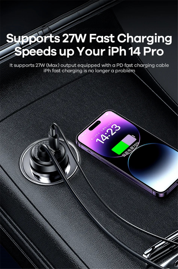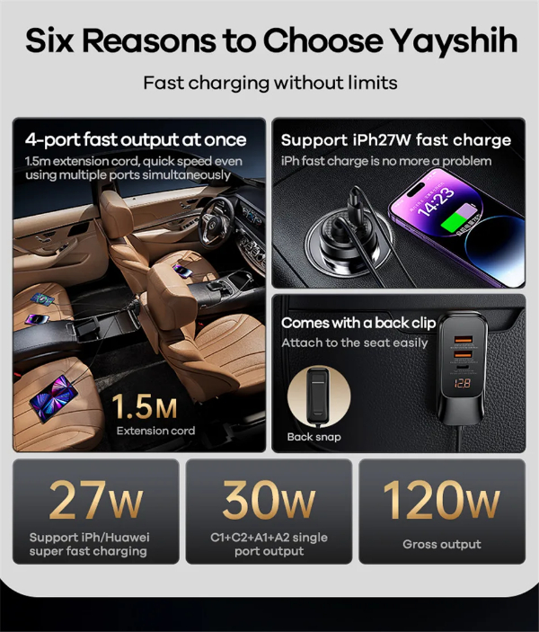 | Material and Technology :(1) Appearance material: PC+ aluminum alloy ring Input Voltage:DC12V-24V Output Voltage:①C1+C2+A1+A2(30W+30W+30W+30W) USB-A1/A2.:5V3A/9V3A/12V2.5A 30W (Max) Output total:120W Rated Power:(1) No-load power: ≤0.5W (2) Full load power: ≤120W" 1. With 1.5M extended cable, worry-free charging 2. 4 independent fast charging ports, average output of single port to 30W, total 120W CTN G.W:19.9±0.2Kg CTN SIZE:60*35*49CM |