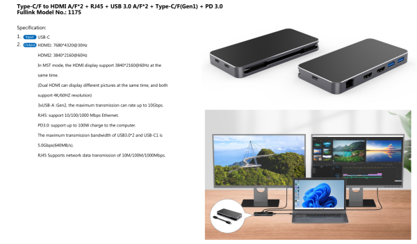 1175/1176 7-in-1USB-C Docking Station USB-C/M to 2xHDMI+RJ45+2xUSB-A GEN1+USB-C Gen1++PD3.0(100w)