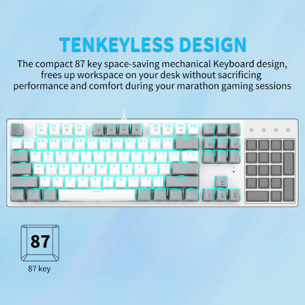 • 【Portable Mechanical Keyboard】: This is a 87 keys compact mini mechanical keyboard with clear panel and type-c removable connecting line, it's good for all environment, business travel games office home use, without Numpad, more practical for Gamers and Typist, give more space to your desktop.