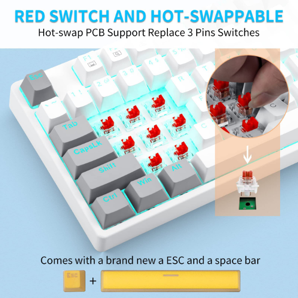 • 【Hot-swappable and double Injection Keycap】: Hot-swap PCB allows you to replace 3 pins switches freely without soldering issue, you can enjoy the fun of DIY different switches on one keyboard, making your own unique keyboard. The double injection keycap provide crystal clear uniform backlight and never fade.