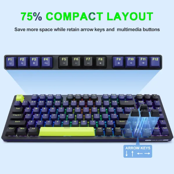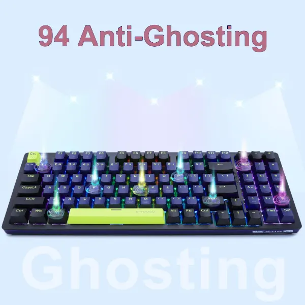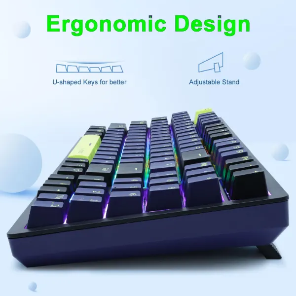 | Number of keys: 94 keys Keyboard material: ABS injection molding shell Keycap material: PBT two-color injection keycap Hot-swap: hot-swap sleeve Connection method: wired connection Button life: 50 million times Backlight mode: rainbow backlight effect Keyboard structure: sinking structure design Connection return rate: 1000Hz Wire length: about 1.5 meters Available devices: winXP/visa/win8/win10/win11 Working current: <180mA E-sports game keyboard chip, high-performance processor Foldable feet, ergonomic and more comfortable play various games 10 kinds of lighting effects can be changed arbitrarily (FN+shift key switch) FN+↑ brightness increase, FN+↓ brightness reduction FN+←/→ Backlight operation speed adjustment |