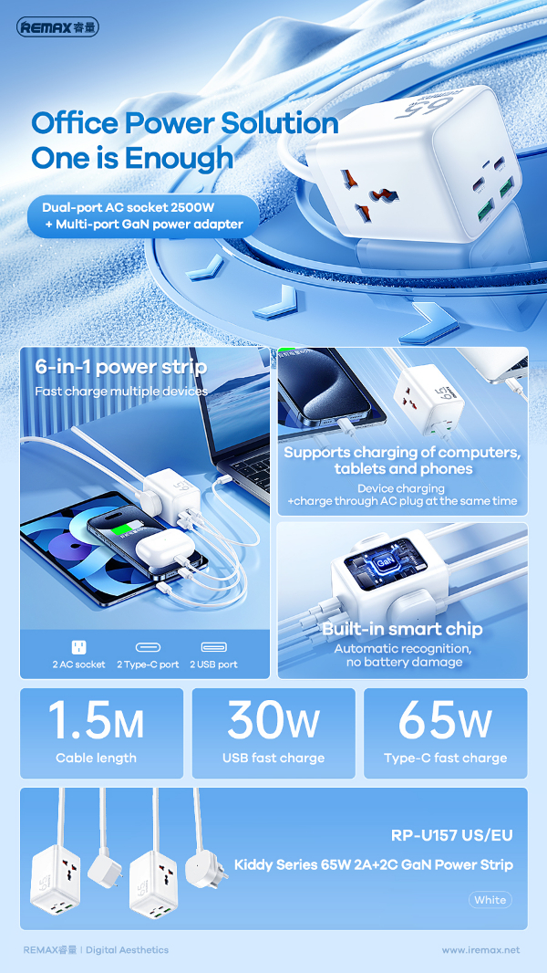 REMAX RP-U157-Kiddy Series 65W 2A+2C GaN Power Strip RP-U157 EU/US