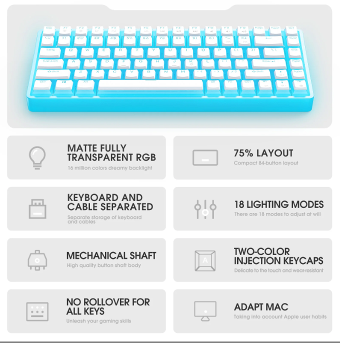 Key lifespan: 50 million times Light effect: 18 modes (FN+INS switching) Mode: Supports 5 fixed game modes Key illuminated