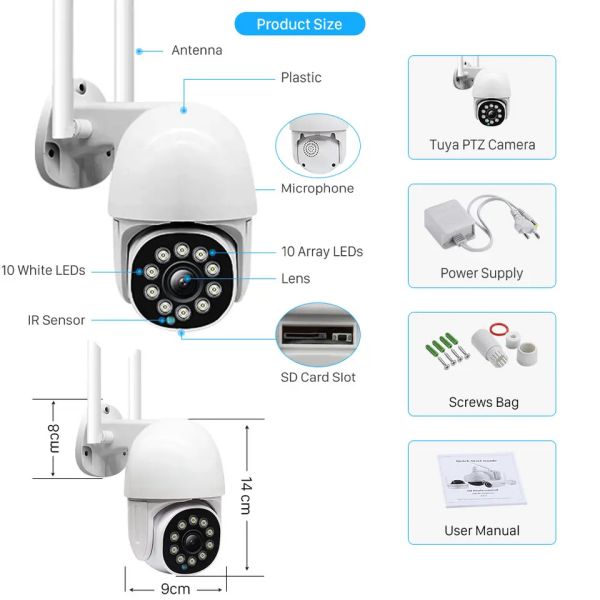 ● Smart WIFI PTZ camera; ●APP: Casacop (Alexa/Google Home optional); ● 2.0/3.0 MP optional; ●Adding devices by scanning code or connecting network directly, or by AP hotspot; ●Support voice monitoring, intercom, motion detection and alarm; ●Support cloud storage; ●Support IOS / Android mobile phone remote monitoring; ●Wired network port RJ-45 10-100MB, wireless network 802.11b/g/n; ●Power supply: DC12V 1.5A, ●Working temperature: -20℃-+55℃; ● Support 8-128G TF card storage; ●Waterproof Index: IP66, work for both indoor and outdoor |