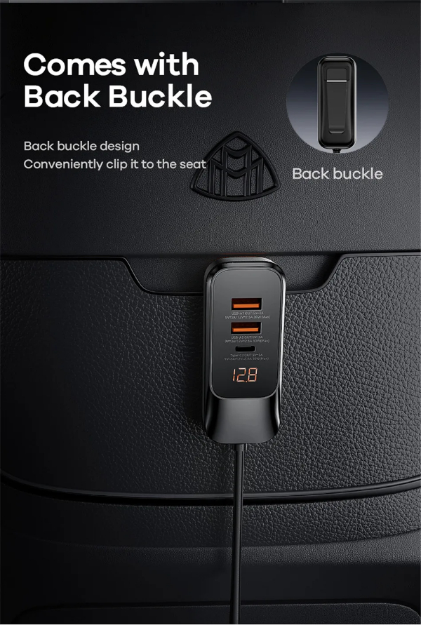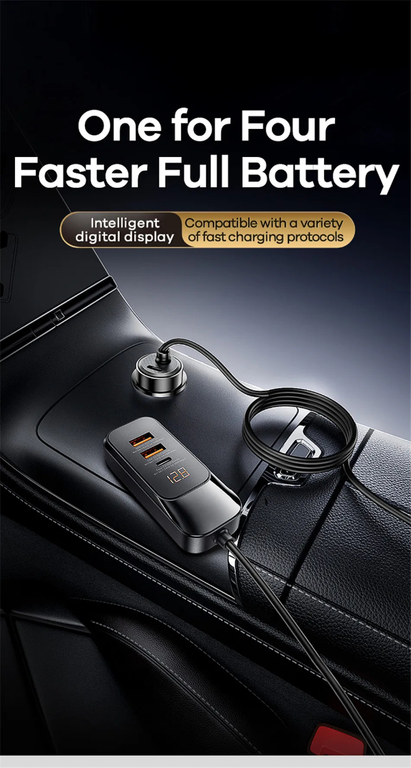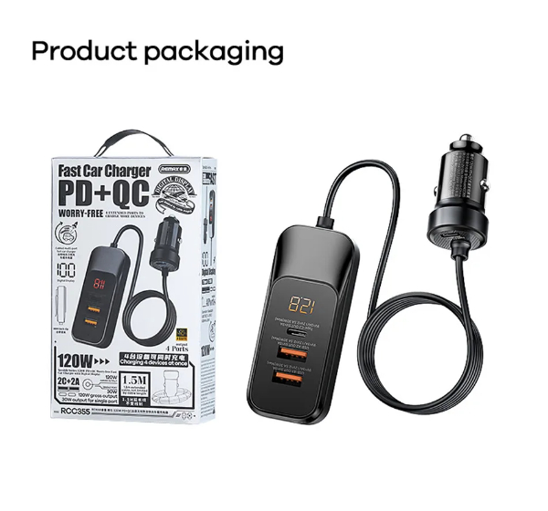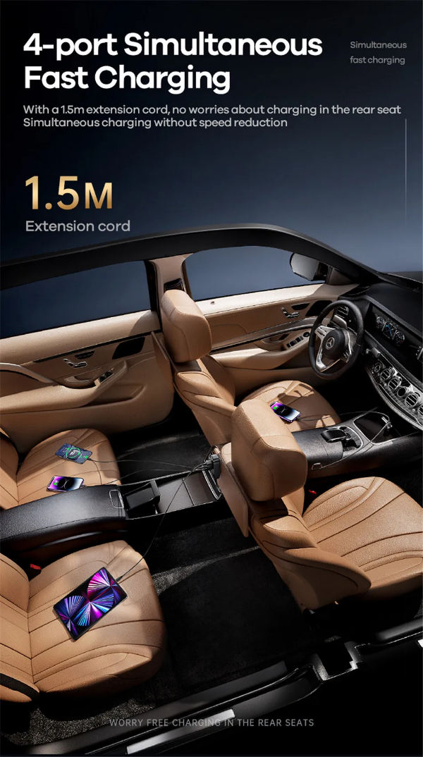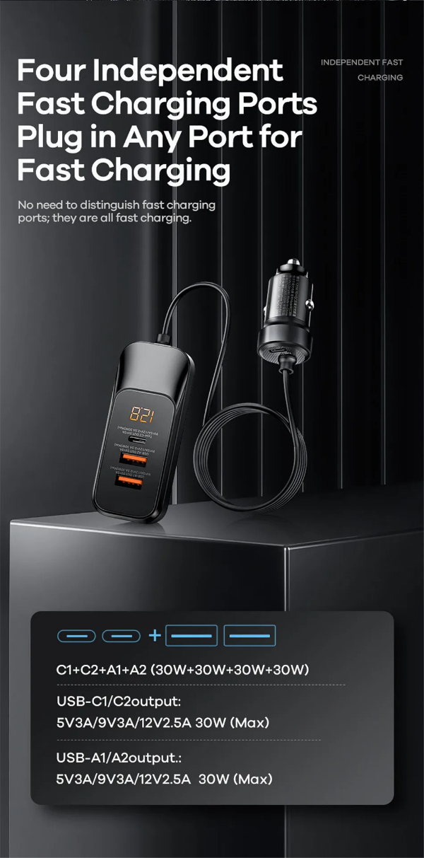| Material and Technology :(1) Appearance material: PC+ aluminum alloy ring Input Voltage:DC12V-24V Output Voltage:①C1+C2+A1+A2(30W+30W+30W+30W) USB-A1/A2.:5V3A/9V3A/12V2.5A 30W (Max) Output total:120W Rated Power:(1) No-load power: ≤0.5W (2) Full load power: ≤120W" 1. With 1.5M extended cable, worry-free charging 2. 4 independent fast charging ports, average output of single port to 30W, total 120W CTN G.W:19.9±0.2Kg CTN SIZE:60*35*49CM |