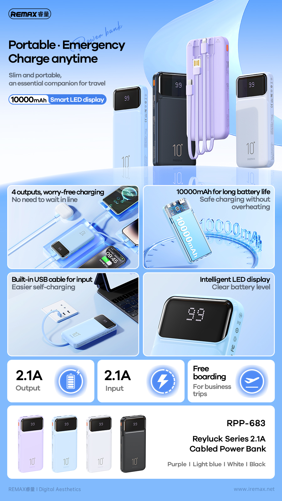Built-in Type-C Cable Output: 5V/2.1A(Max)