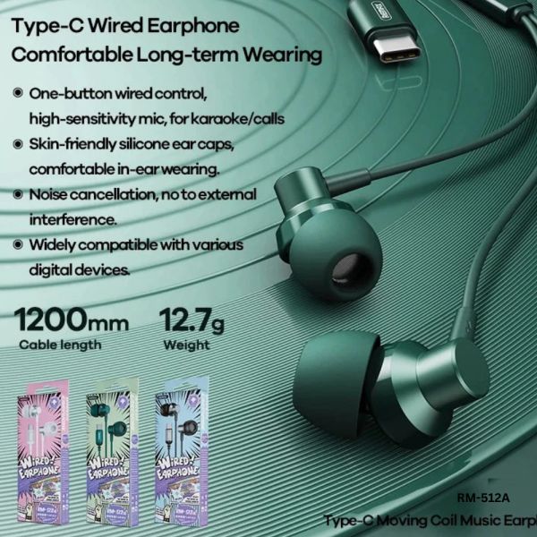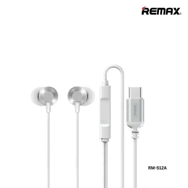 REMAX RM-512A TYPE-C EARPHONE (WIRED) ( METAL ), FOR MUSIC & CALL (1200MM),Type C Earphone , Type C Wired Earphone,Type C Headphone,Type C Stereo Sound Wired Headset ,USB C headphone , Type C Wire Ear