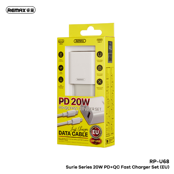 REMAX RP-U68 (1C1A charger+cable)-REMAX Surie 20W PD+QC Fast Charger Set RP-U68 (1C1A charger+cable) EU-white