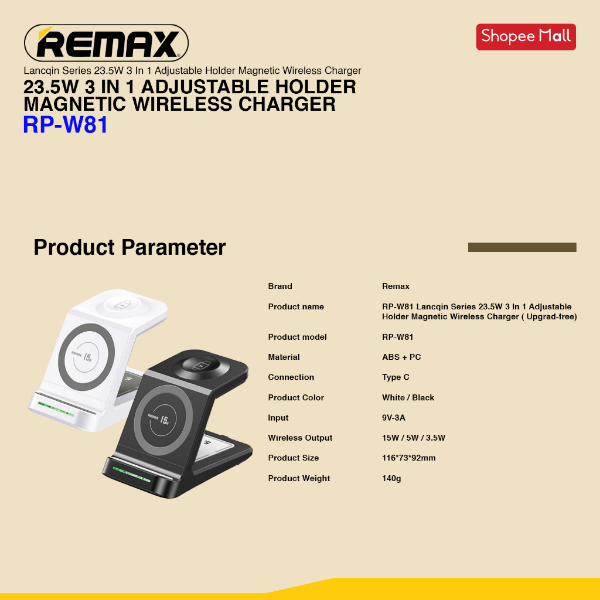 * Product name : RP-W81 Lancqin Series 23.5W 3 In 1 Adjustable Holder Magnetic Wireless Charger ( Upgrade-free)